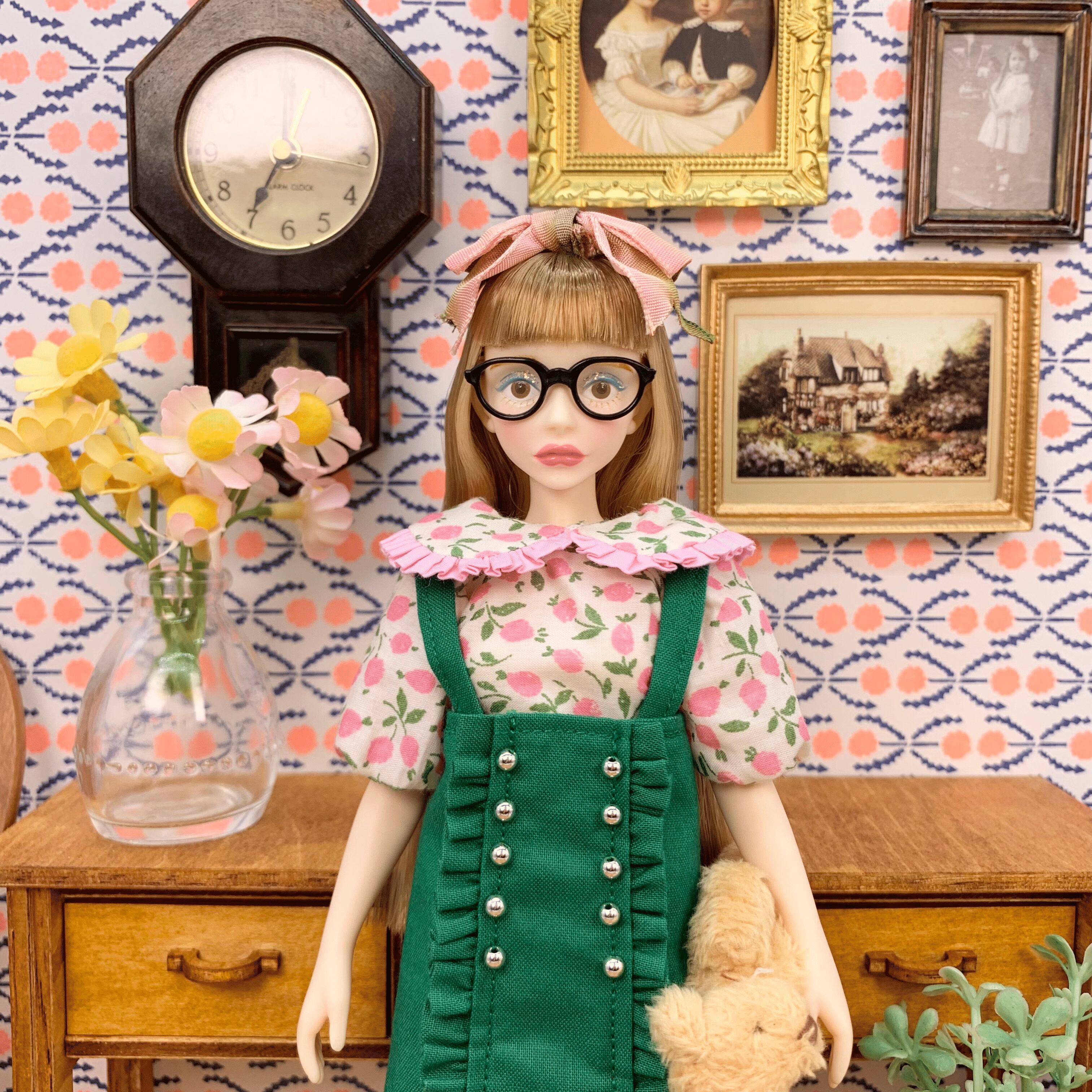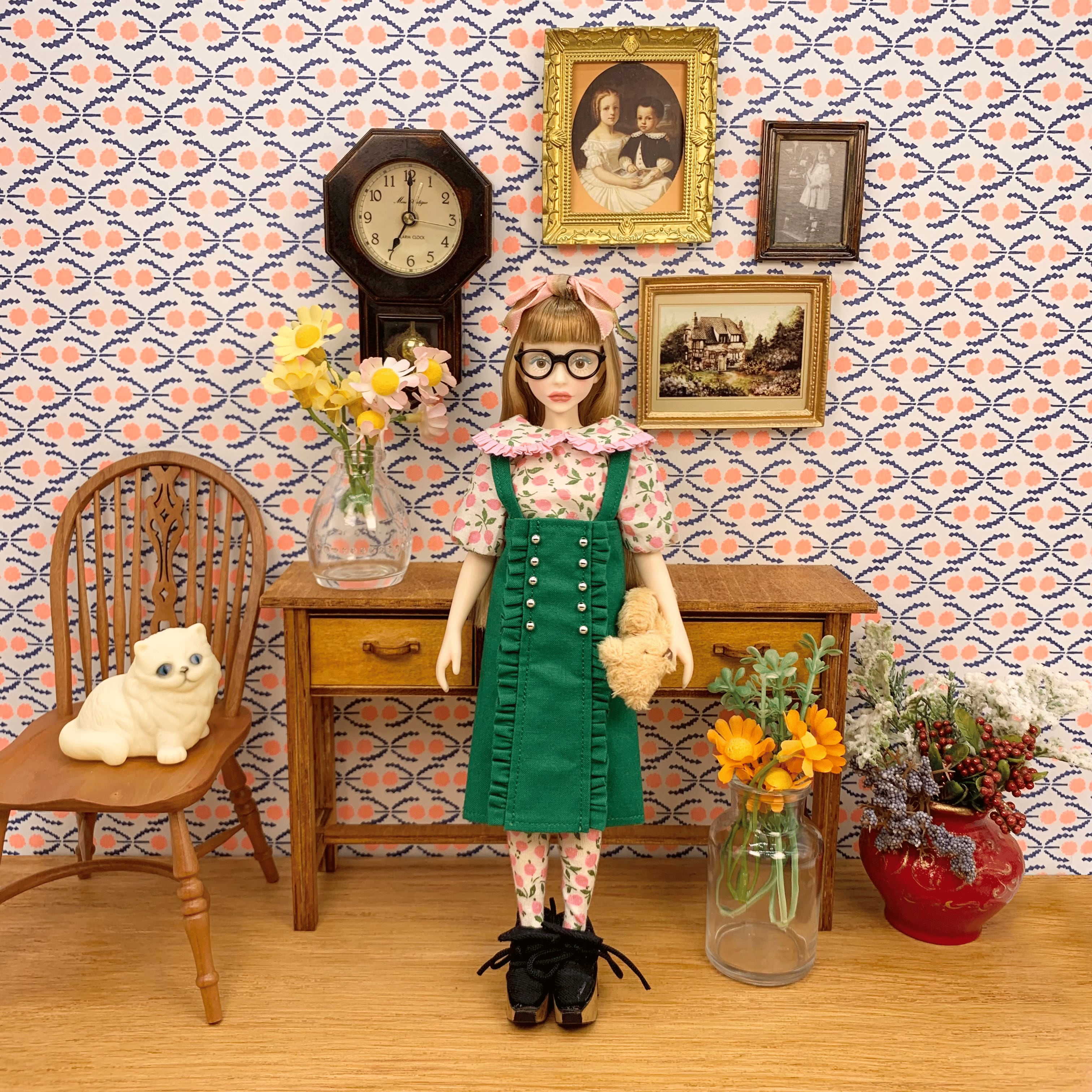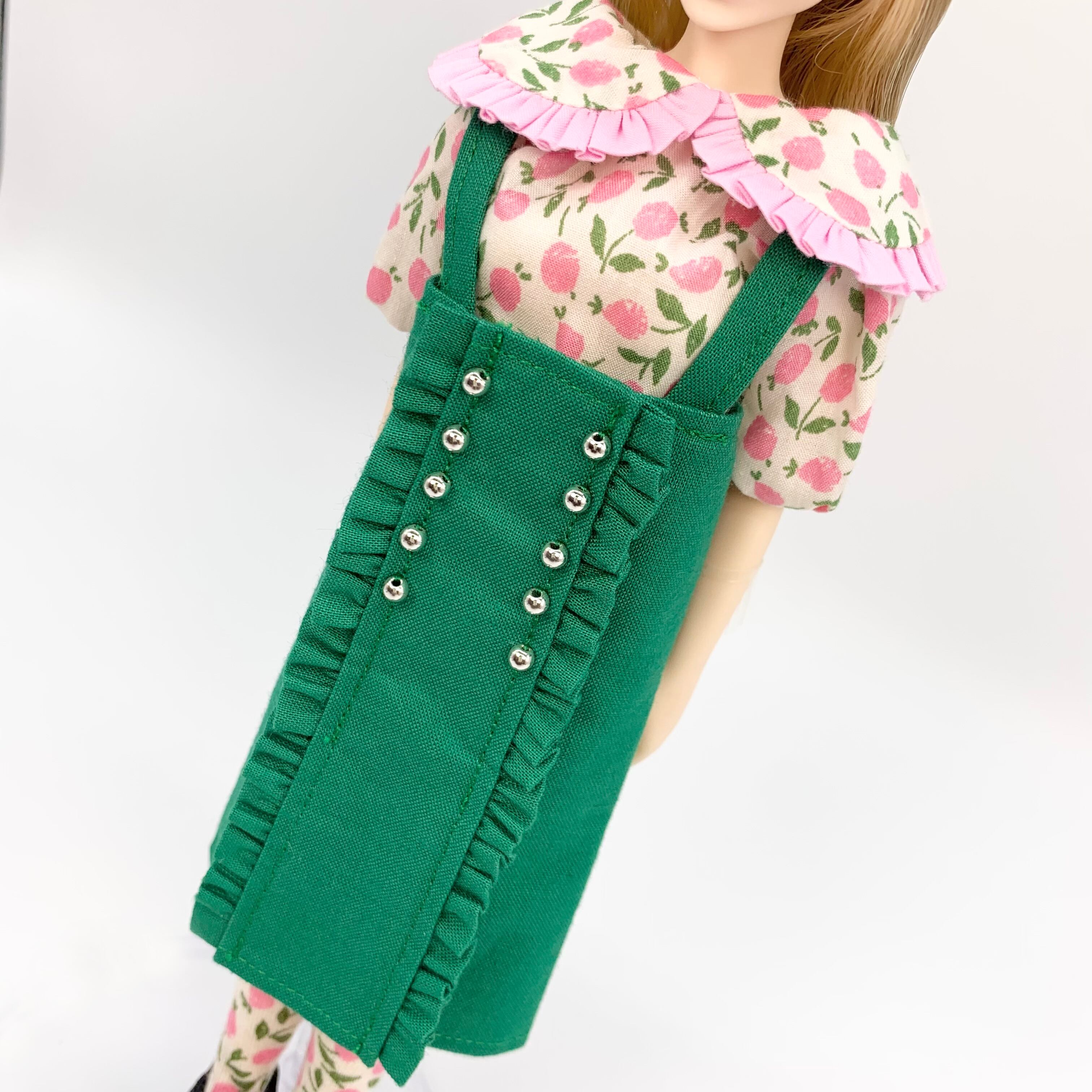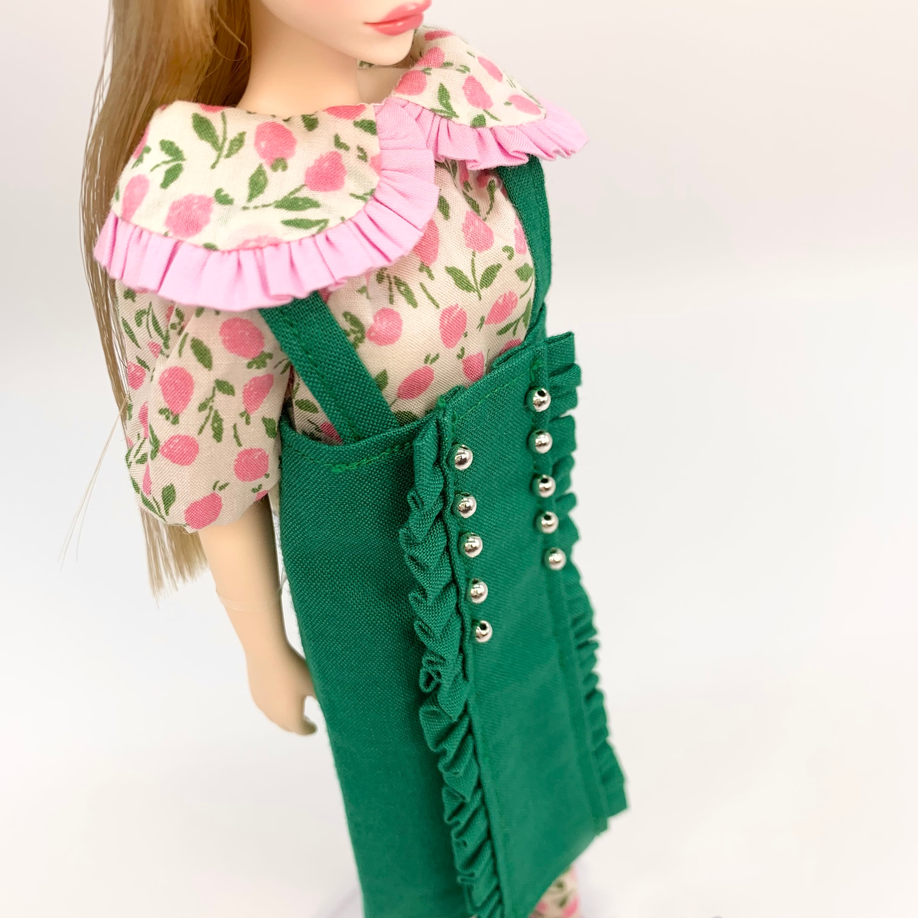 チェリーちゃん、22㎝ドールサイズのリバティ生地を使用した花柄フリル襟ブラウスと、エイティスクエア生地のジャンスカ(グリーン)、ブラウスと同じ柄のソックスの3点セットです。